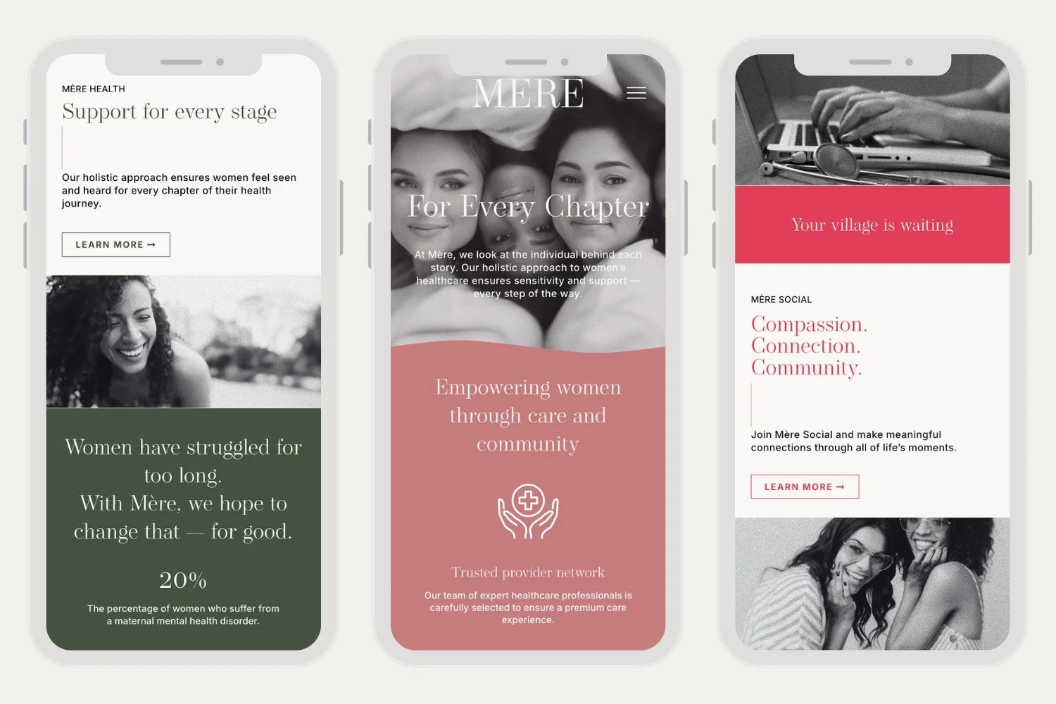 The Mère website is both inviting and empowering. Through compelling copy and cohesive design, the site communicates Mère’s approach to women’s wellness while inspiring trust and connection with their audience.
